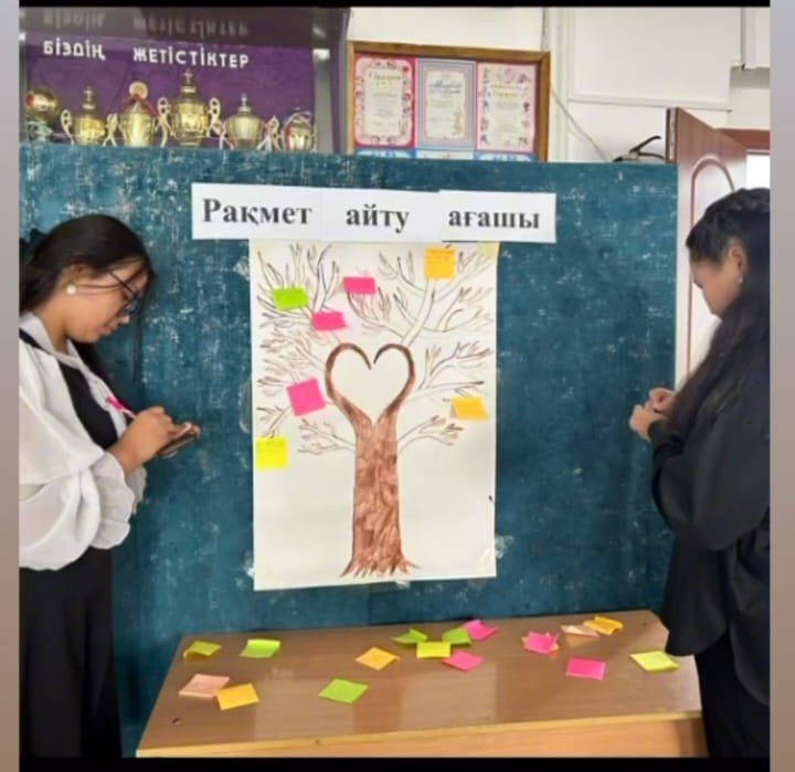 Оқушылар өздерінің жүрекжарды тілектері мен алғыстарын түрлі-түсті жапырақтарға жазып, ағашқа ілді.