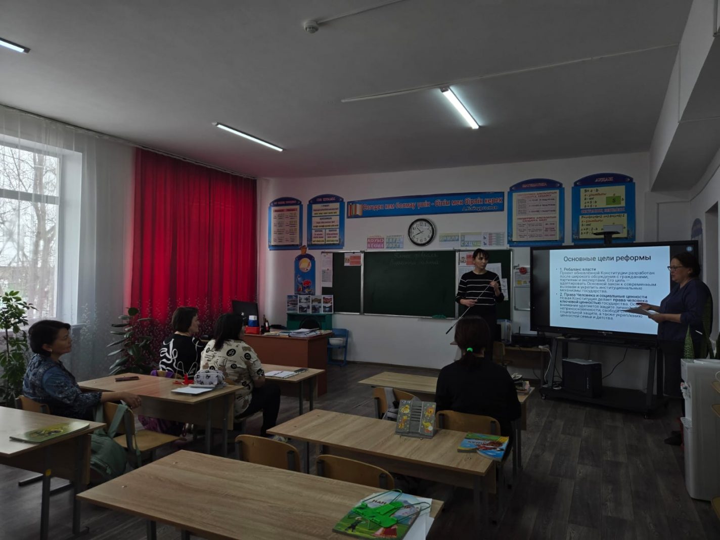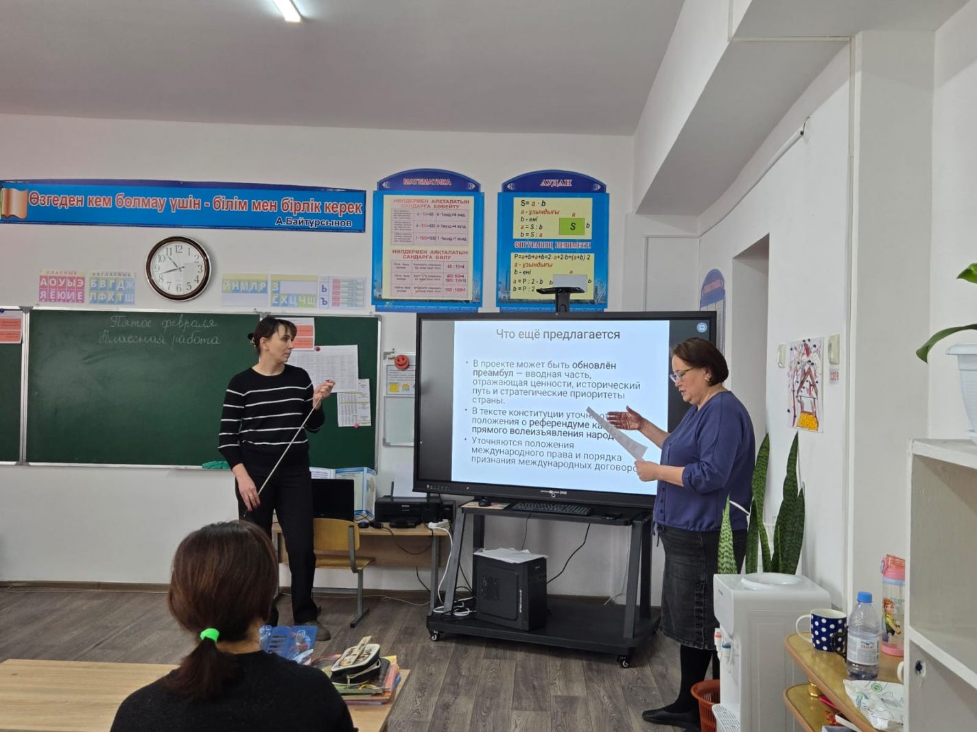 Азаматтық өзін-өзі тану мен құқықтық мәдениетті нығайтуға бағытталған іс-шаралар аясында «ҚР Конституциясы — тұрақтылық кепілі» тақырыбында педагогикалық ұжыммен кездесу өтті. Кездесу барысында қоғамдық тұрақтылықты, азаматтық келісімді қамтамасыз етудегі Конституцияның рөліне және конституциялық құндылықтардың маңызына ерекше көңіл бөлінді.